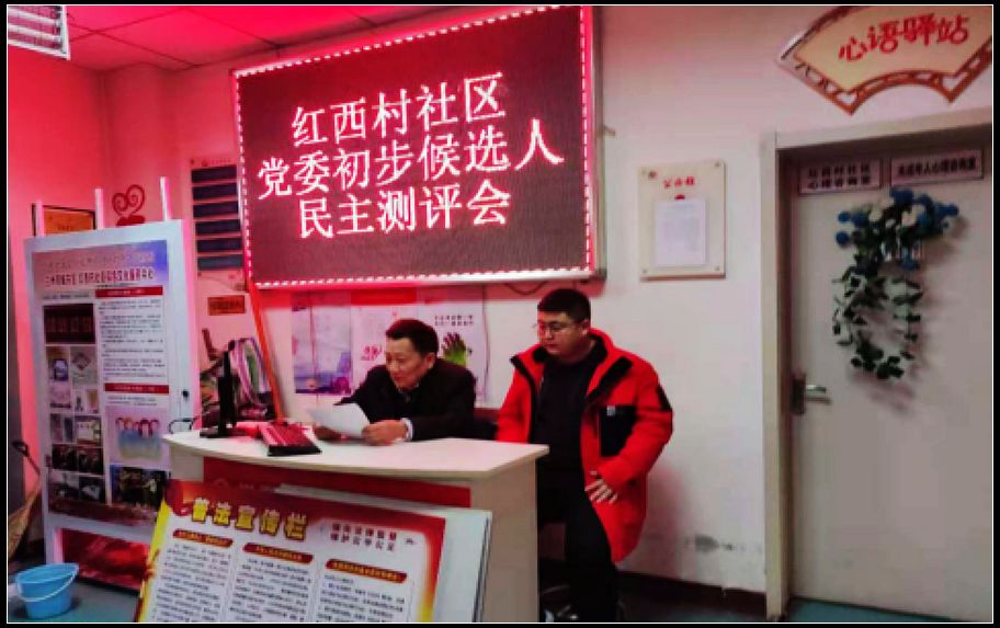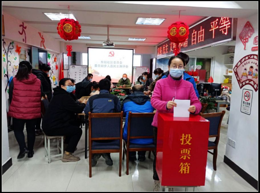 各社区委员会召开民主测评会议,参加人员有社区全体干部、专干、本社区党员、群众代表等。工作人员向测评人员发放《民主测评表》(测评表主要围绕初步候选人思想素质、工作业绩表现、带富致富能力、群众工作能力等方面进行打分评价),待民主测评员填好测评表,按顺序逐一进行无记名投票。