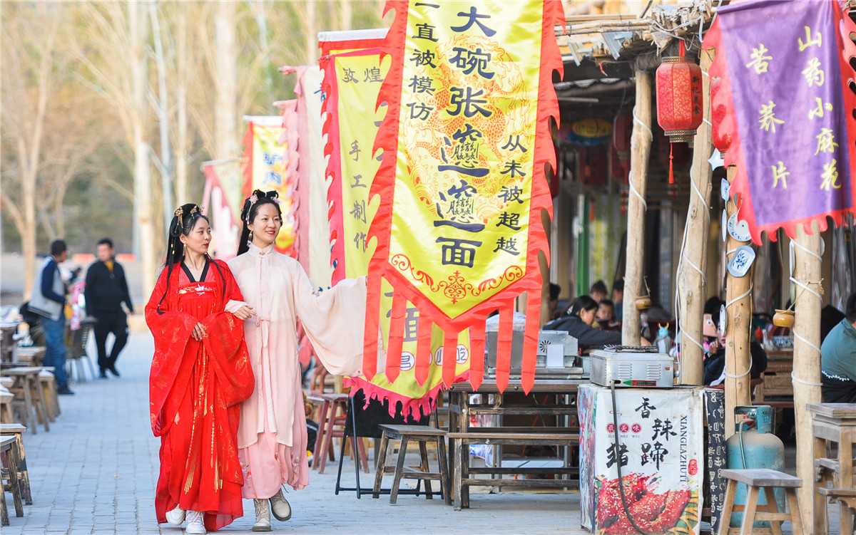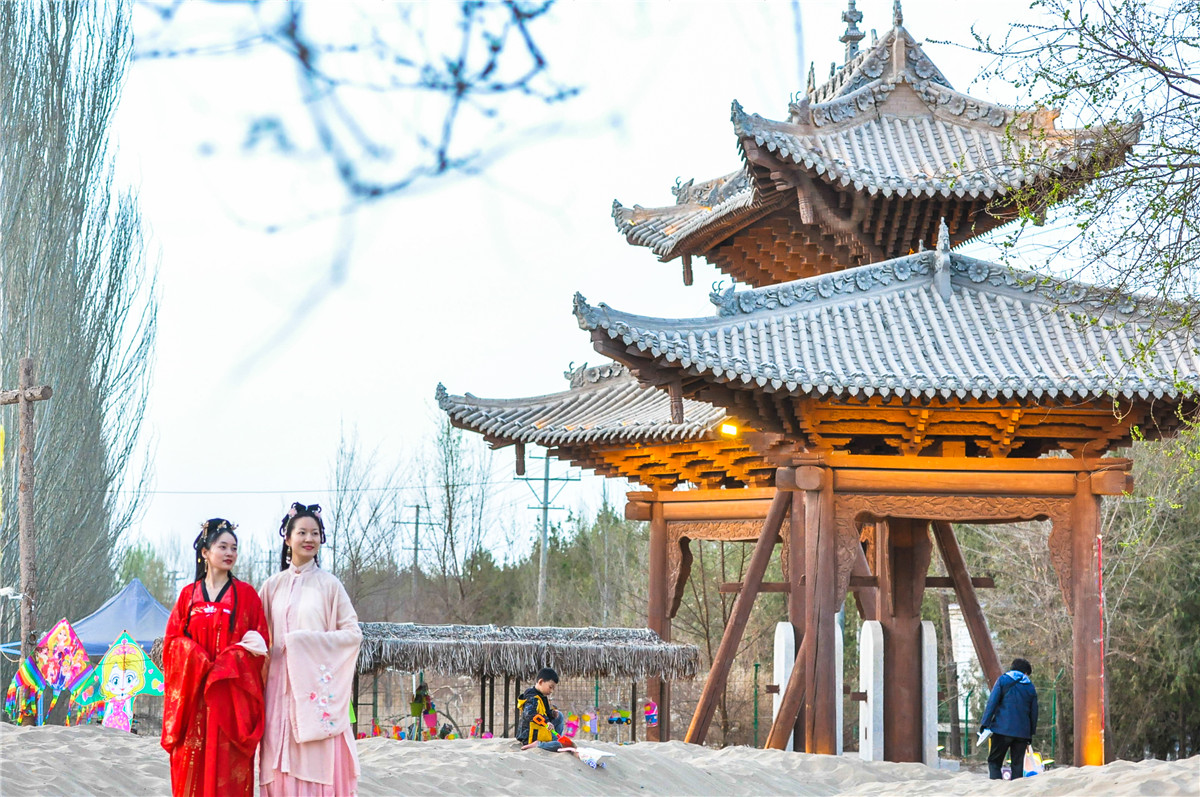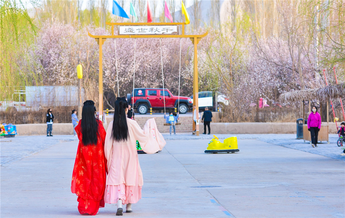赏花、游园、畅游敦煌小镇。