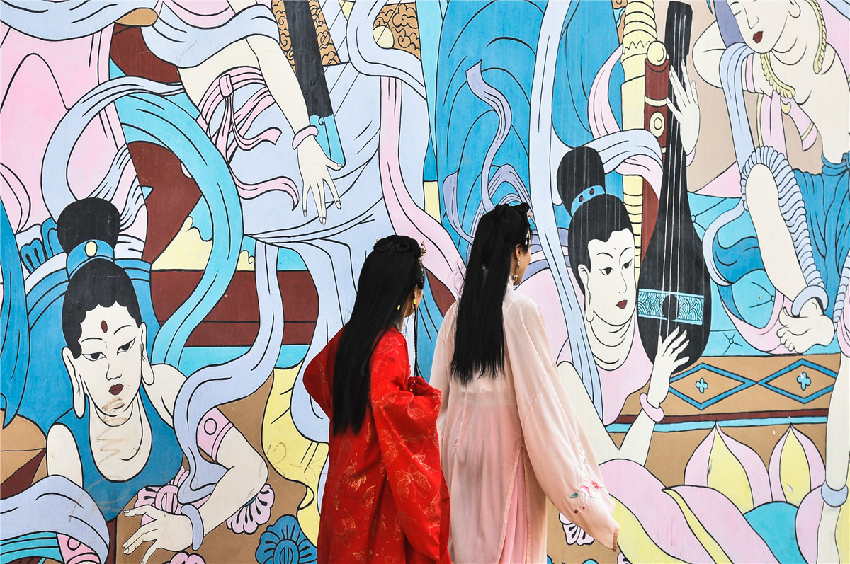 汉服女子与古镇壁画融为一体。