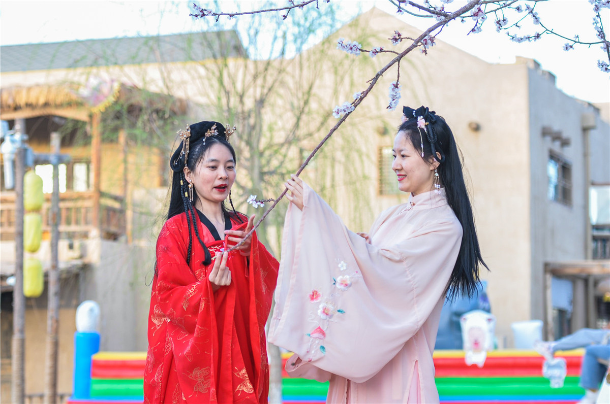 小镇东侧、南侧的杏花林百花齐放,吸引了很多游客前来游玩赏景。