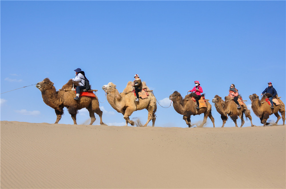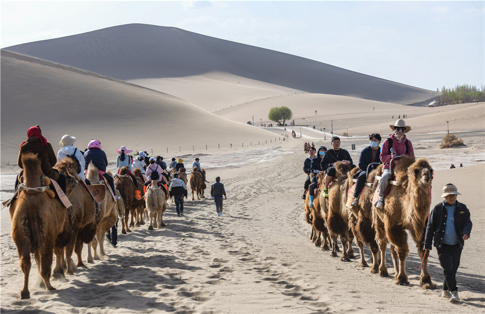 4月5日,游客骑骆驼畅游鸣沙山,体验敦煌大漠风光、丝路风情。
