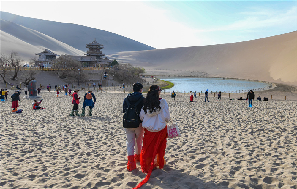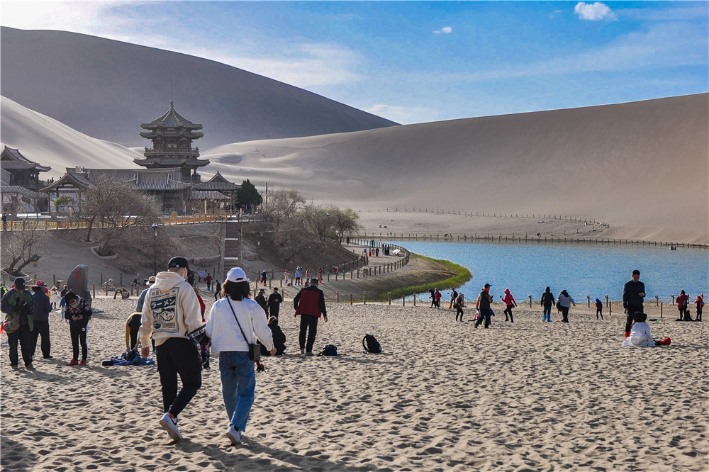 4月5日,游客在月牙泉景区观赏春日月牙泉美景。