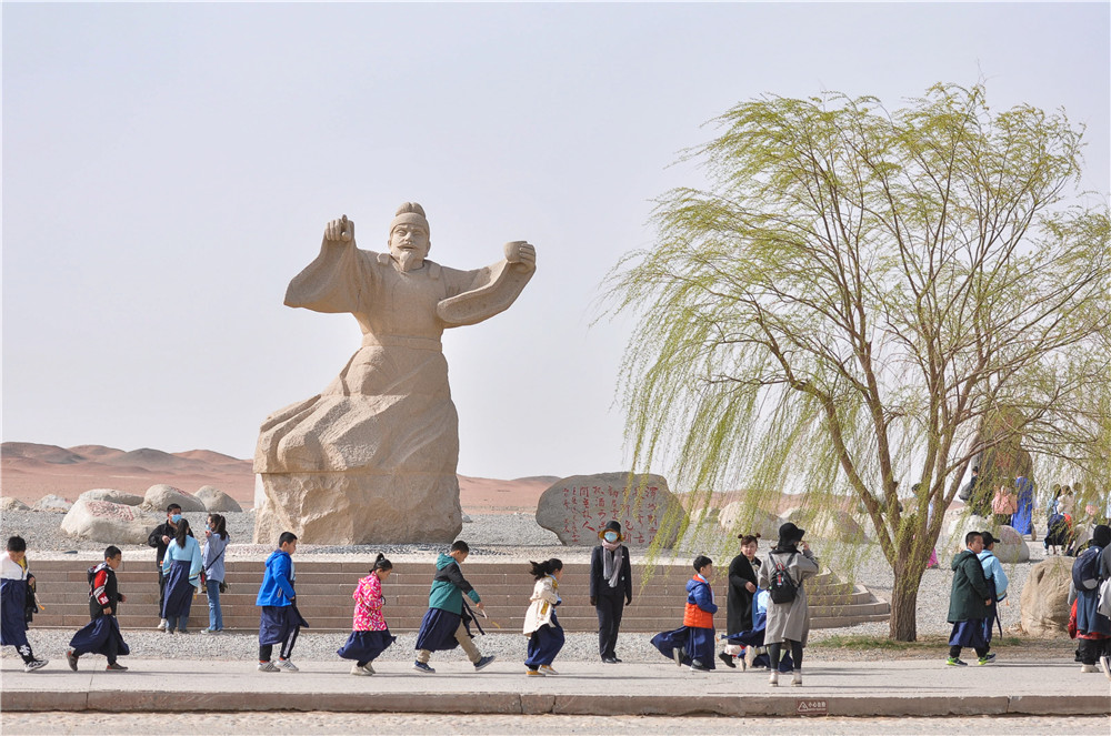 4月5日,一个小学生研学游团队在阳关景区进行研学体验。