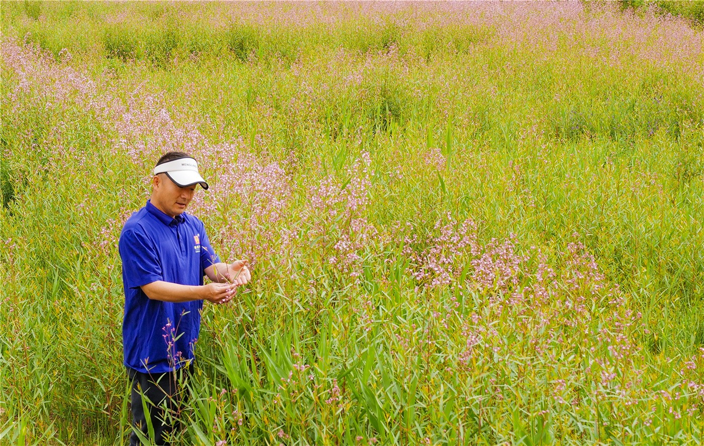 2023年5月23日,敦煌鸣沙山罗布麻花盛开,敦煌罗布麻茶开发者吴强观看罗布麻生长情况。