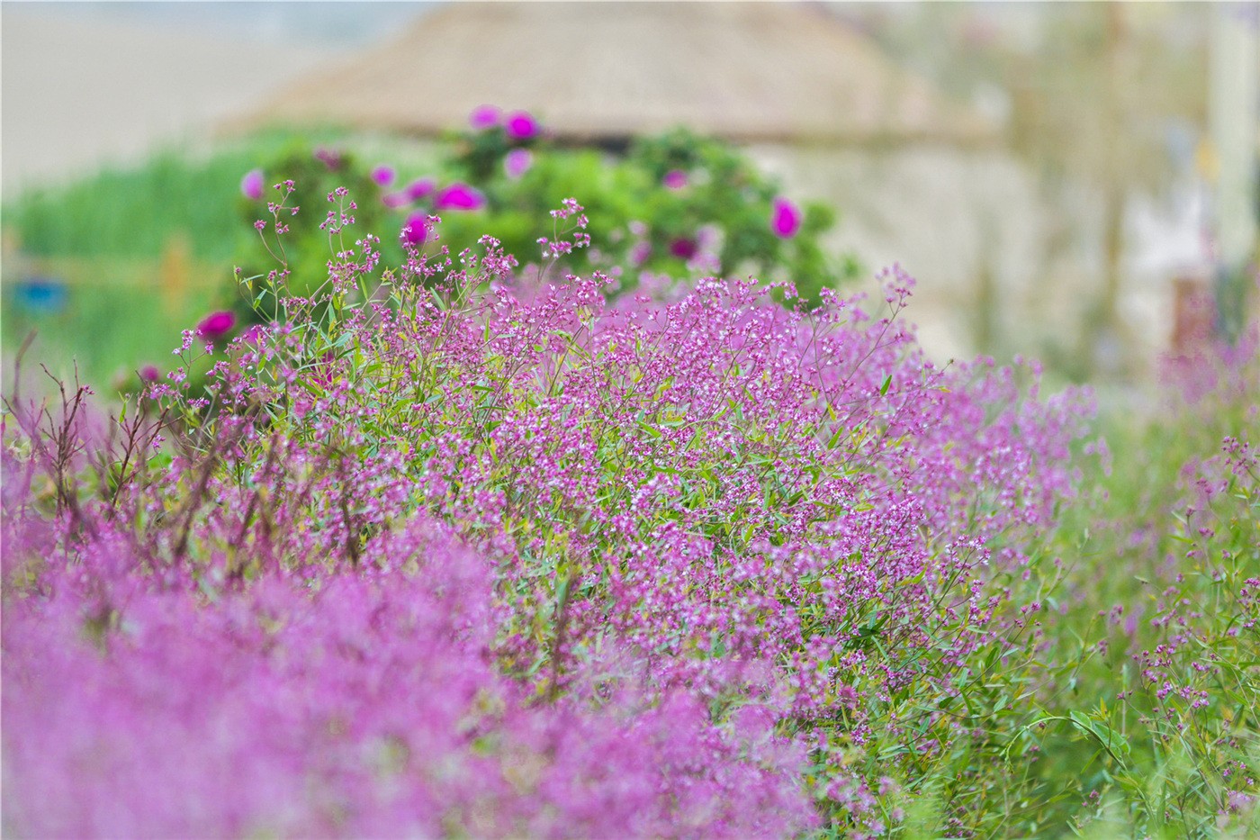 2023年5月23日,鸣沙山下罗布麻花盛开,形成大片花海,吸引众多游客前来赏花、游玩。