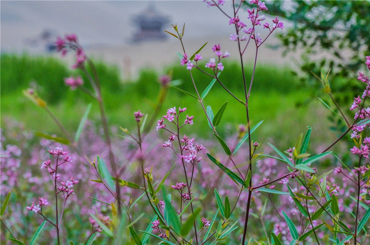 敦煌鸣沙山月牙泉景区,野生罗布麻花竞相开放。五色沙、铁背鱼、罗布麻被称为月牙泉三宝,罗布麻也被称为敦煌八大怪之一。