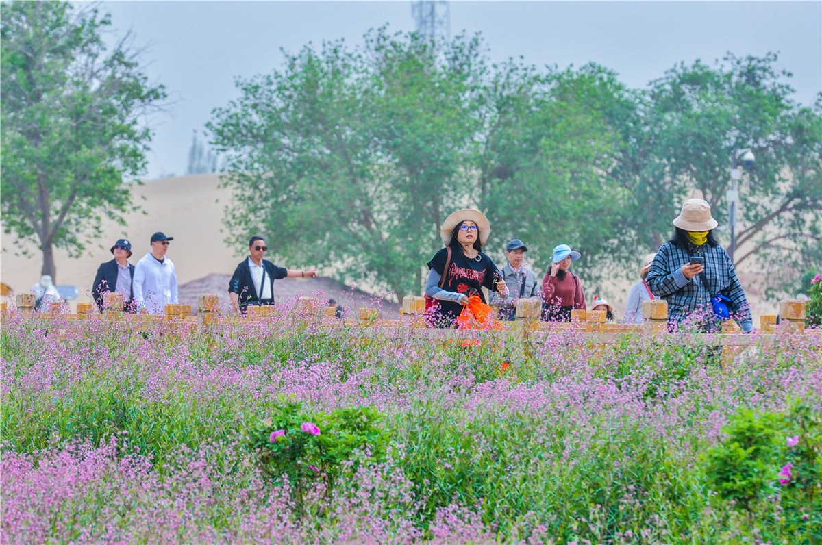 游客在鸣沙山月牙泉景区赏花、拍照。