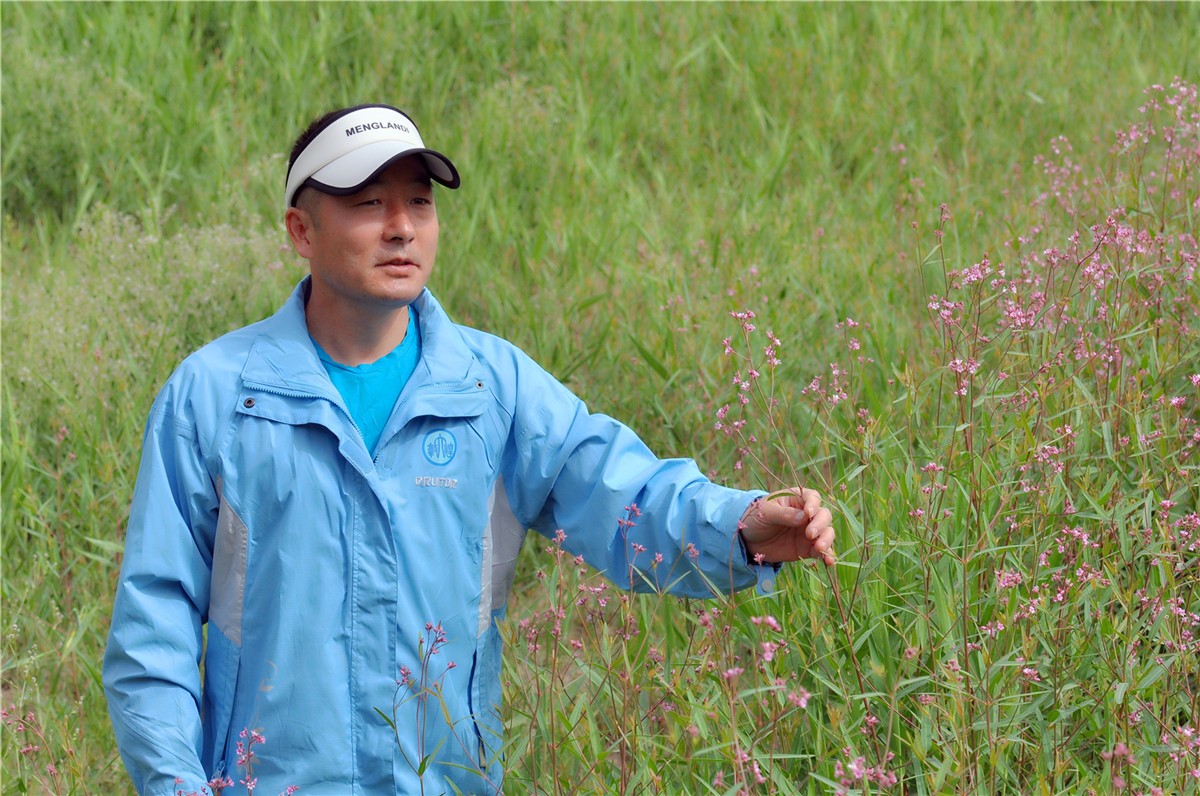 敦煌罗布麻开发中心负责人吴强正在查看敦煌罗布麻生长情况。
