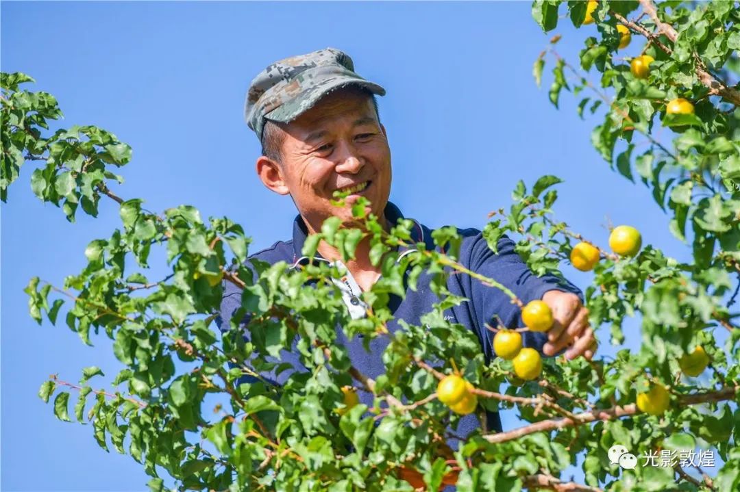 7月4日上午,在敦煌市七里镇南台村的杏园里,果农正在采摘成熟的李广杏,准备发往外地。一颗颗金黄油亮的杏子挂满枝头,成片的杏园里飘散着甜甜的杏香,处处都是一派忙碌的景象。