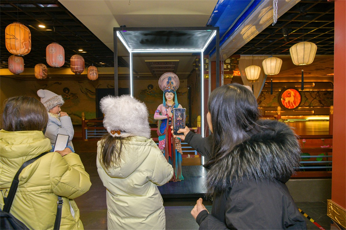 图为:2026年1月20日晚,游客与《乐动敦煌》演员互动、合影。