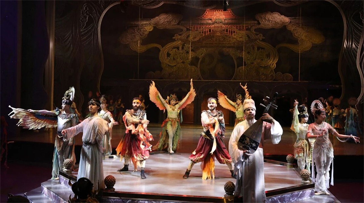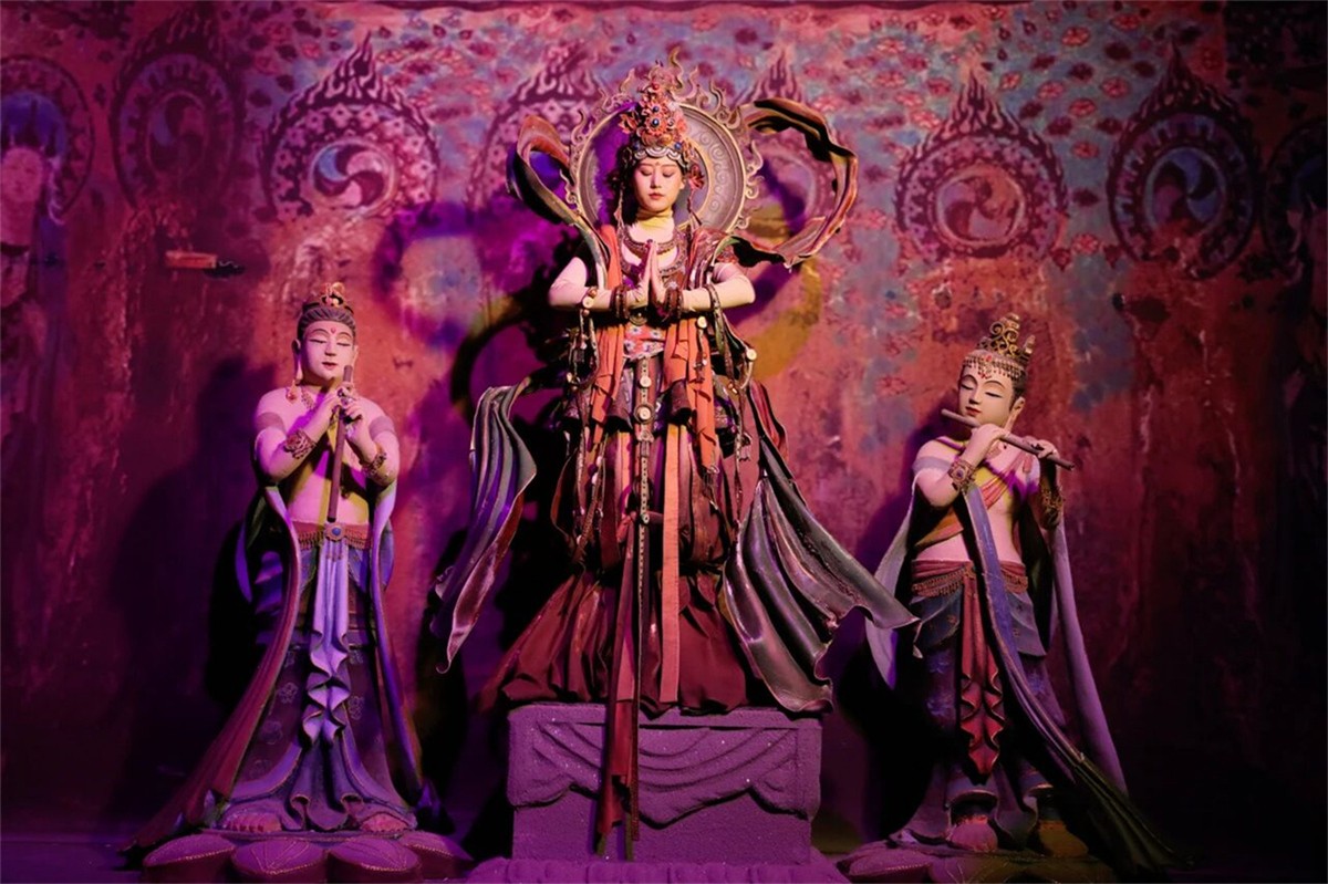 作为全球首部洞窟式沉浸体验剧,《乐动敦煌》以莫高窟壁画、藏经洞古籍为蓝本,深度复原50余件古乐器与25首千年古谱,通过全息投影、3D威亚等高科技手段,将“反弹琵琶”“胡旋舞”等壁画场景立体呈现。西域少年白氏的艺术追寻之旅,让观众从“看壁画”变成“入壁画”,实现与千年丝路文明的深度对话。