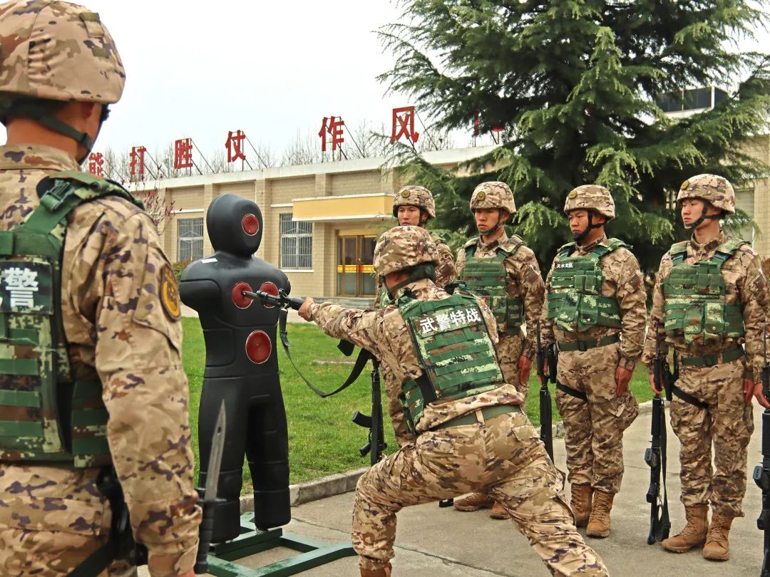 擒敌和刺杀操教练员正在为队员纠正动作,他们集思广益,在教学中增加了肌肉力量训练,融入散打、搏击等元素,共同钻研刺杀组训法,并将各种情形模拟其中,一套动作精准有力、一气呵成。