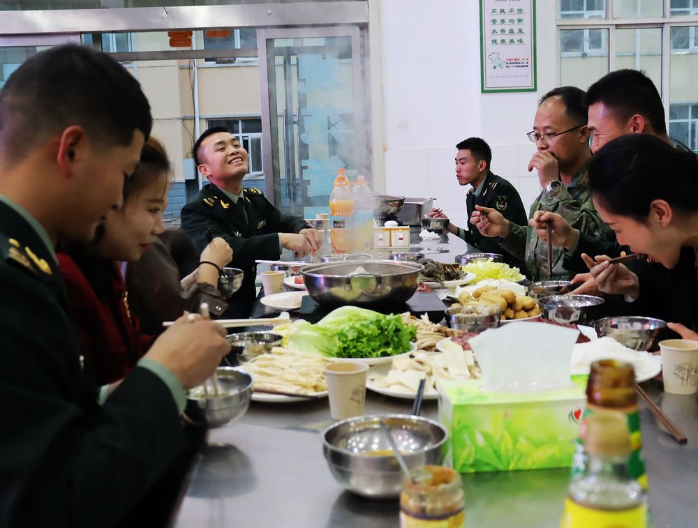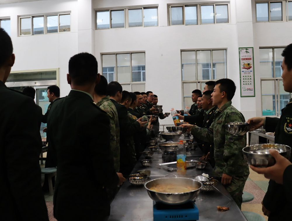 暖心先暖胃,热气腾腾的火锅与西北的十月显得格外匹配,走进饭堂就感受到了一股麻辣鲜香,战友们挑选着自己喜爱的食材,调配着秘制蘸料,吃的津津有味。