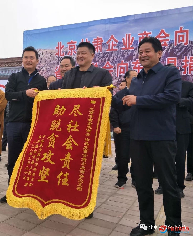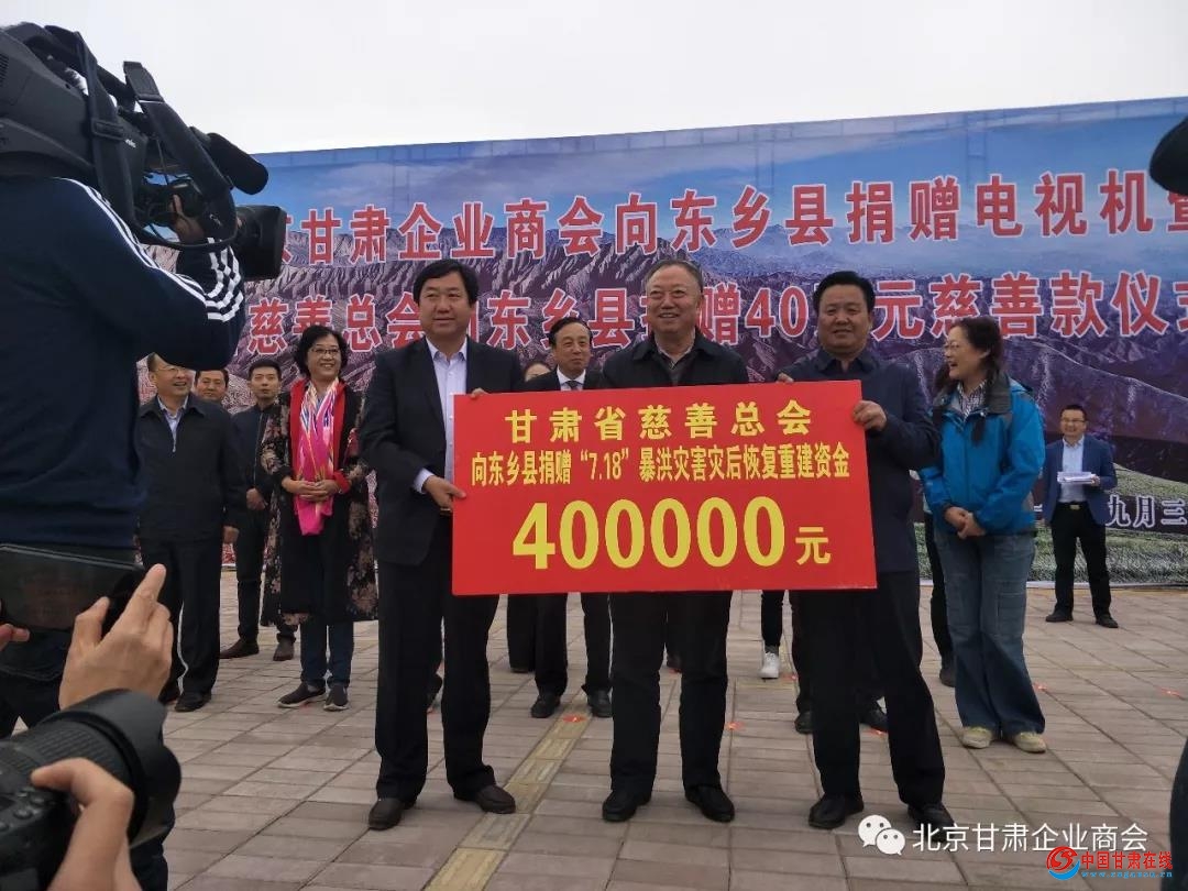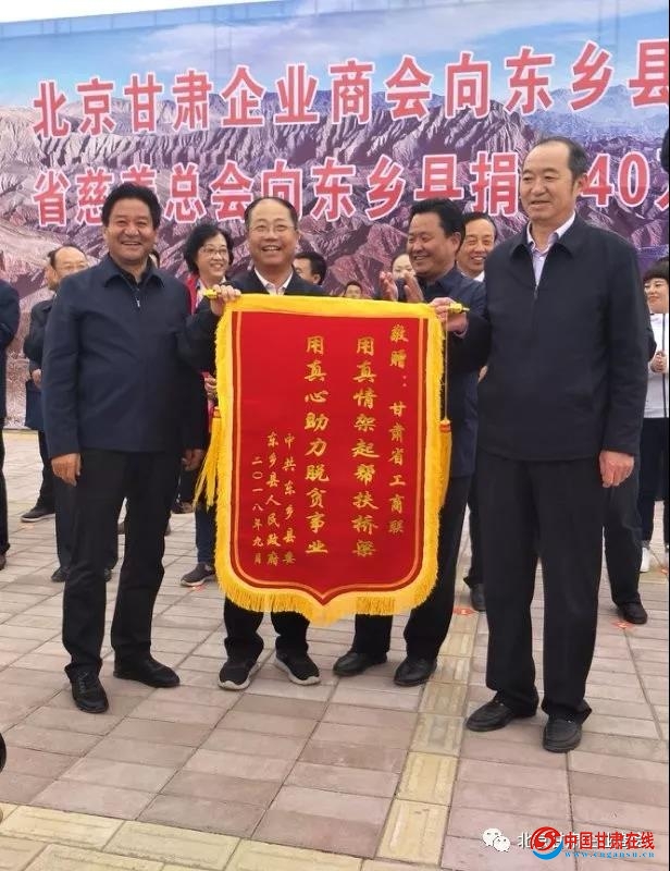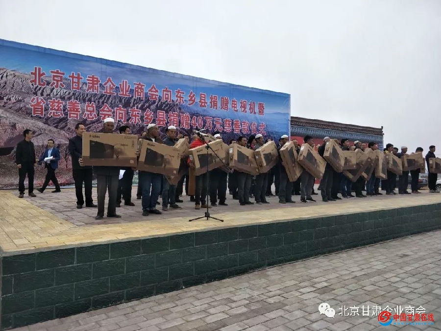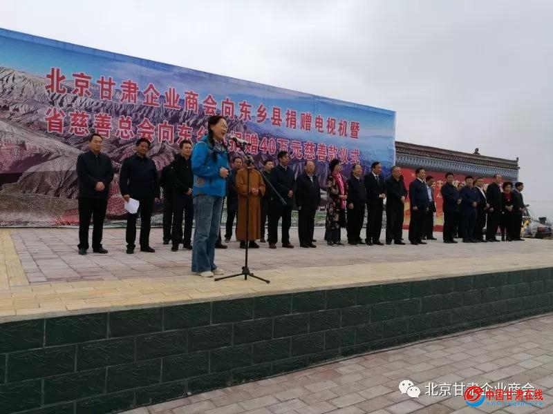 2018年9月30日下午,在东乡县龙泉镇拱北湾村举行了由北京甘肃企业商会向东乡县捐赠电视上线暨省慈善总会向东乡县捐赠40万元慈善款仪式,全国政协常委、省政协副主席、省工商联主席郝远,省人大常委会原副主任、省慈善总会会长朱志良,省委统战部副部长、省工商联党组书记赵少智出席捐赠仪式。东乡县委书记马生荣、北京甘肃企业商会执行会长瞿金叶分别致辞。