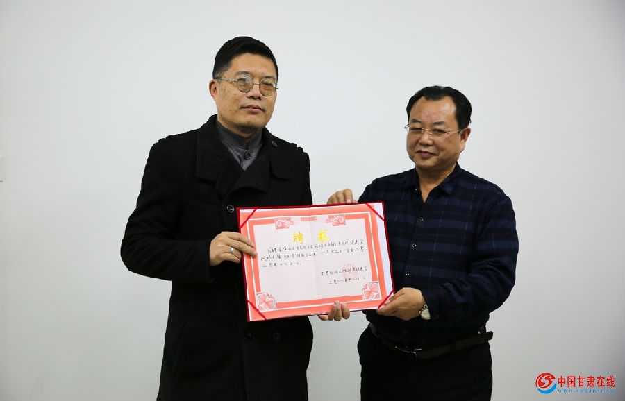挂牌仪式后,甘肃丝绸之路经济文化促进会会长侯鹏为新聘任的荣誉主席、高级顾问等颁发了聘书,其中杜少华任荣誉会长、杨耀春任首席顾问、解(xie)放任首席顾问、朱旭东任顾问兼副秘书长、钟国庆任主席、李欢任对外联络宣传部副部长、任稼祥任高级顾问、事业发展部部长、赵小春任高级顾问,对外宣传部副部长,事业发展部部长。