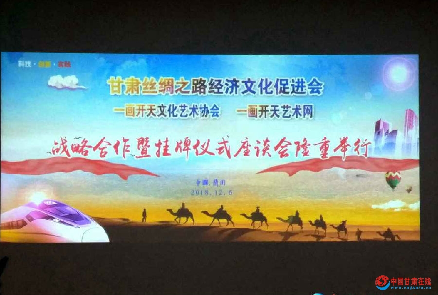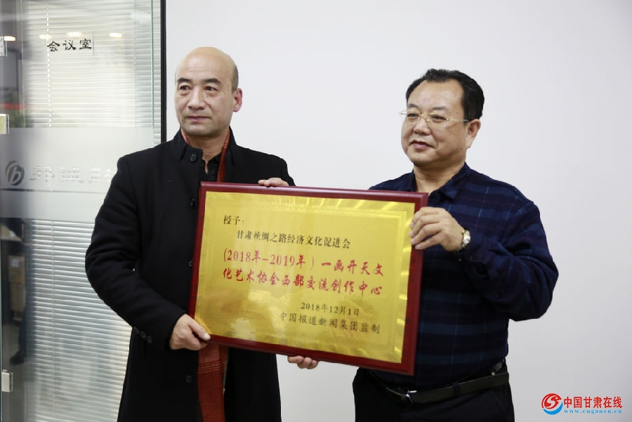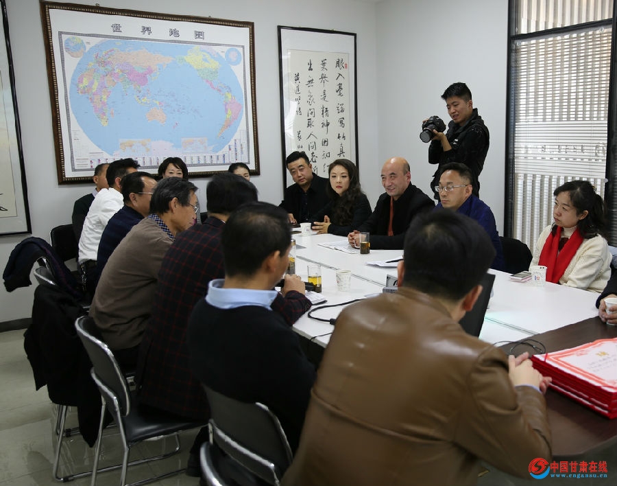 中国甘肃在线兰州讯(责任编辑:赵小春)12月7日上午,经过两个多月的筹备和策划,甘肃丝绸之路经济文化促进会与一画开天文化艺术协会战略合作暨挂牌仪式座谈会今天上午在甘肃省会兰州举行。参加本次揭牌仪式和座谈会的参合人员有: 中国报道新闻集团总裁杜少华,甘肃丝绸之路经济文化促进会会长侯鹏,甘肃省人大常委会法委办原主任、甘肃省人大立法研究会研究员解(xie)放,浙商集团董事局主席钟国庆,一画开天文化艺术协会常务主席朱旭东,中国报道新闻社副社长李欢,甘肃科技报执行总编辑任稼祥,中国甘肃在线网总编辑赵小春等共计30余人。