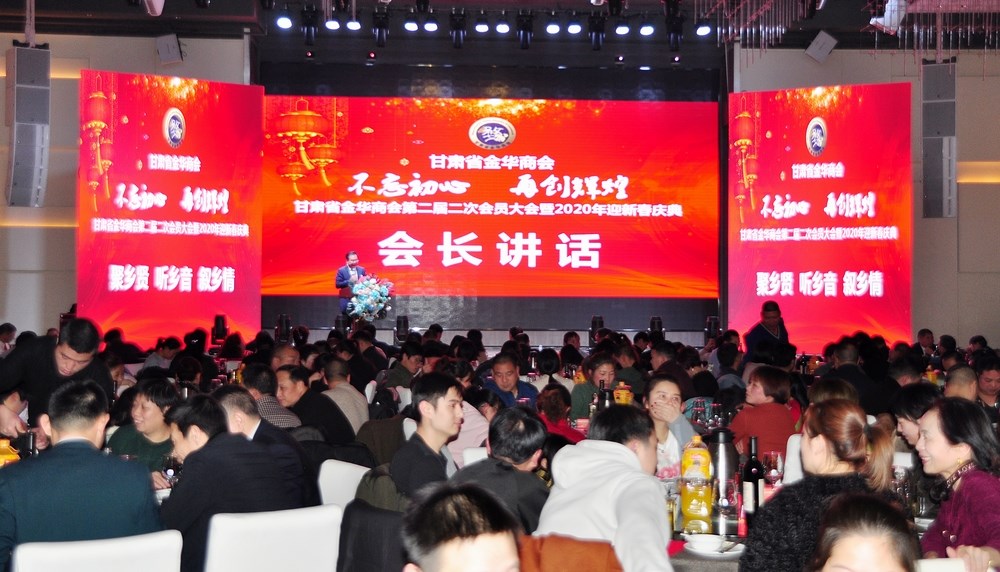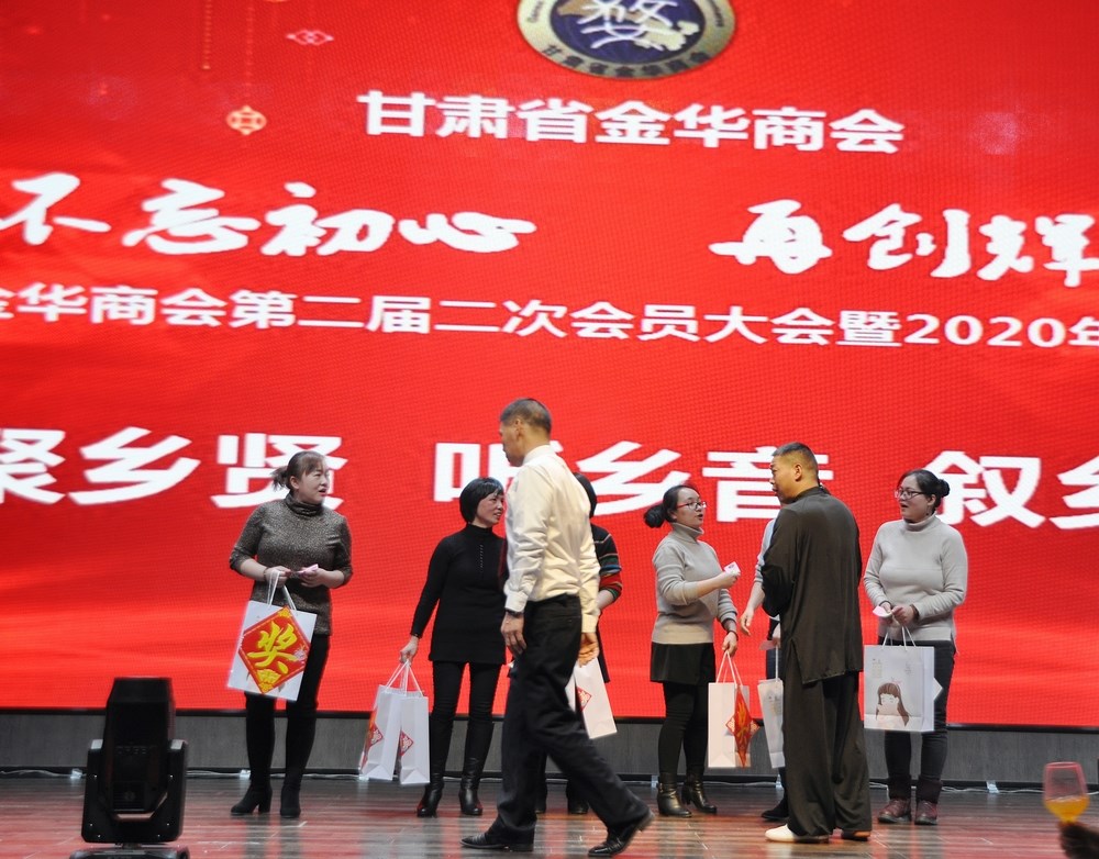 中国甘肃在线兰州讯(文/图:赵小春 胡晓蝶)在2019年即将结束,2020年元旦到来之际,甘肃省金华商会于12月25日在金城兰州举办主题为“不忘初心,再创辉煌”的甘肃省金华商会第二届二次会员大会暨2020年迎新春年会庆典。商会邀请了甘肃省有关单位领导,商会、协会领导,知名企业家,商界精英及在兰经商、创业、工作的金华老乡和会员出席本次年会。他们共聚一堂,聚乡贤,听乡音,叙乡情,增友谊,递关爱,送温暖。借此年会召开之际,商会公布增补常务副会长,副会长,理事,成立新的党支部,评选优秀党支部,评选先进个人,颁发商会突出贡献奖,设立党员示范岗。并为他们颁发证书、授牌。为甘肃曙光公益发展中心捐助50万物资,并互授牌匾。同时邀请兰州高山传媒为年会献上歌曲,舞蹈,广场舞,杂技,武当剑,太极拳,太极十三刀等优秀精彩节目。