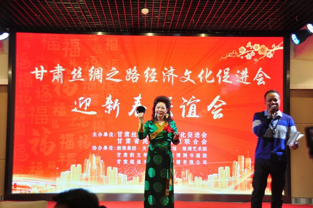 中国甘肃在线兰州讯 (赵小春 胡晓蝶报道)金猪摇尾辞旧岁,玉鼠探头迎新春!昨天下午,一场别具特色,精彩纷呈的书画笔会、书画拍卖及歌舞演艺,在兰州“伊和园礼宴中心”精彩演绎!这是由甘肃丝绸之路经济文化促进会携手甘肃省民营企业家联合会共同主办的高品质、多色彩的“丝绸之路迎新春联谊会”。