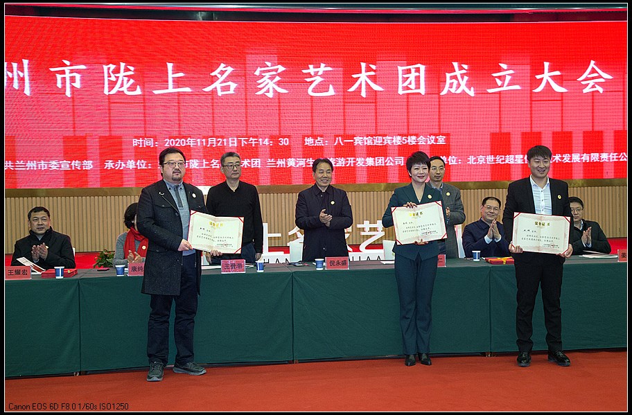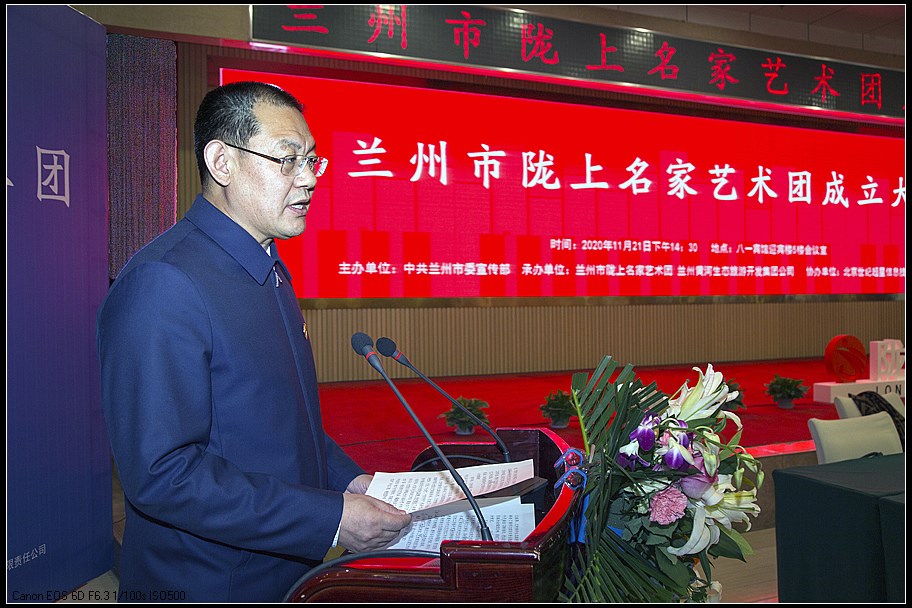 中国甘肃在线兰州讯(赵小春报道)2020年11月21日下午,兰州市陇上名家艺术团在兰州八一宾馆宣告成立。甘肃省文联党组书记、主席王登渤,甘肃省文化和旅游厅副厅长杨建仁,甘肃省退役军人事务厅副厅长康纯梅,兰州市委常委、市委宣传部部长王宏等领导,以及省市有关部门、高校艺术院系负责人,艺术名家、艺术团团员、文旅企业家代表、新闻媒体记者等300余人共同参会,见证陇原文艺劲旅——兰州市陇上名家艺术团的扬帆起航。