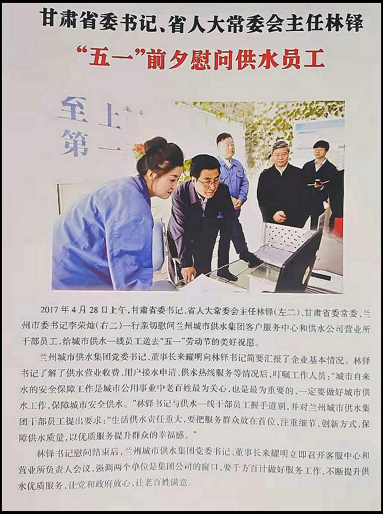 (2017年4月28日五一前夕甘肃省委书记林铎在兰州市委书记李荣灿的陪同下慰问兰州城市供水集团)