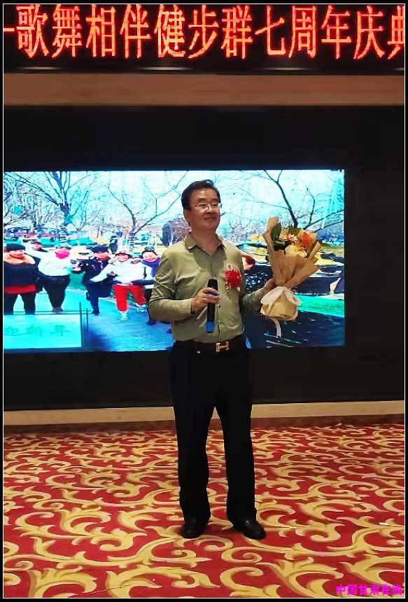 当主持人请歌舞相伴徒步群群主兼公益会会长张玉生先生登台致词时,全场响起了热烈的掌声。张玉生先生满含深情的说:今天,在全国纪念我们党诞生百年光辉历程的浓厚氛围中,我们欢聚一堂,举行歌舞相伴徒步群七周年公益行庆典联欢,颁歌起舞,铭记党恩,彰显公益大爱,践行党的宗旨,回顾播撒公益,具有重要的社会意义。七年春夏秋冬,我们叫响歌舞相伴健行、友爱快乐阳光的口号,凡人善举,拥抱公益,将涓涓爱心润育金城兰州,汇聚成嘹亮的黄河大合唱;七年风霜雨雪,我们在黄河风情线歌舞健行,书写生命的精彩,装点生活的色彩,给美丽的金城兰州增添风采;七年征徒漫漫,我们播撒爱的阳光,从乡村到社区,从烈士家属到孤寡老弱,从赈灾现场到马拉松跑场,处处再现公益人的忙碌的身影;七年一路阳光,我们用爱心传递希望,用脚步丈量衷肠,让陇原大地的热土,空气因爱而甜蜜,清风因爱而和暖,生命因爱而鲜活。这里,作为一个民间公益会的组织者,我感谢歌舞相伴徒步群“公益会旗个2000多个友友们一颗颗生命相遇的爱心……张玉生先生的话音刚落,全场又一次传来响亮的掌声、欢呼声!