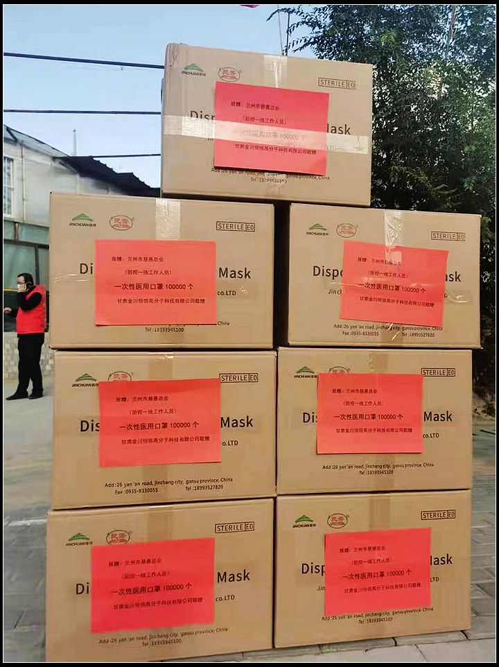 中国甘肃在线讯 新冠肺炎疫情发生以来,在这场没有硝烟的阻击战中,每个人都在为打赢疫情防控阻击战贡献着自己的一份力量。10月31日,在疫情防控关键时期,甘肃省绍兴商会执行会长单位甘肃金川恒信高分子科技有限公司,践行社会责任,向兰州市慈善总会捐赠一次性使用医用口罩十万只,全力支持兰州市一线疫情防控工作。