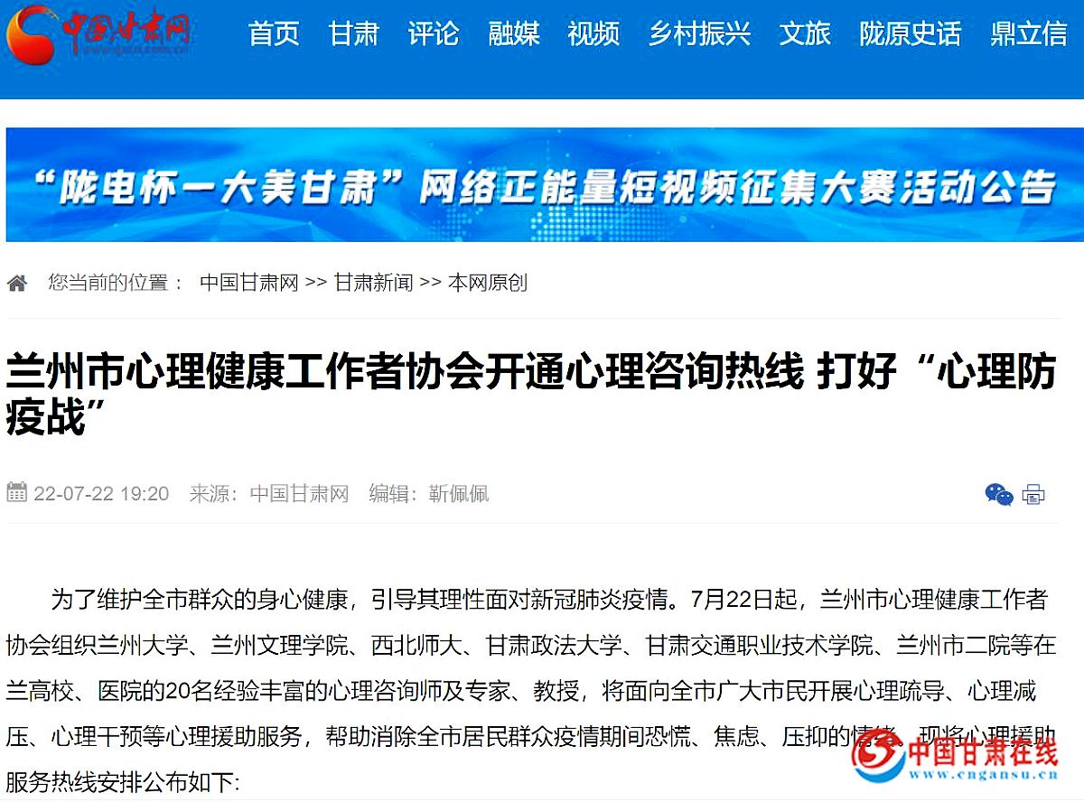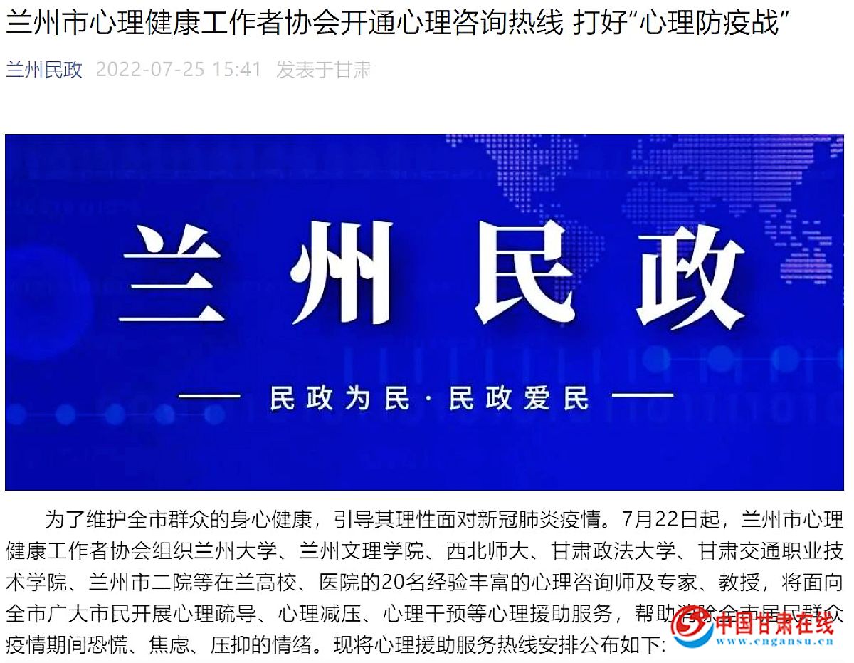 为了维护全市群众的身心健康,引导其理性面对新冠肺炎疫情。从7月22日起,协会组织兰州大学、兰州文理学院、西北师大、甘肃政法大学、甘肃交通职业技术学院、兰州市二院等在兰高校、医院的20名经验丰富的心理咨询师及专家、教授,面向全市广大市民开展心理疏导、心理减压、心理干预等心理援助服务,帮助消除全市居民群众疫情期间恐慌、焦虑、压抑的情绪。心理援助服务热线安排公布如下: