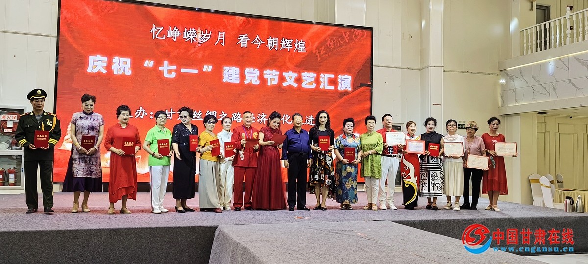 文艺节目演出结束后,甘肃丝绸之路经济文化促进会领导为优秀团队颁发了荣誉证书。庆祝“七一”文艺盛会在欢快的旋律中划上了圆满的句号!