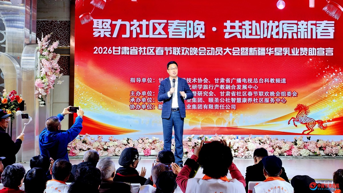 中国甘肃在线兰州讯 2025年11月14日,2026甘肃省社区春节联欢晚会动员大会暨新疆华垦乳业赞助宣言活动在兰州伊和园隆重召开。本次活动以“聚力社区春晚·共赴陇原新春”为主题,汇聚文艺达人、社区志愿者、文艺团队及爱心赞助企业代表,共同吹响这场全民参与的文化盛宴筹备号角,用邻里温情与文化活力点亮陇原新春。