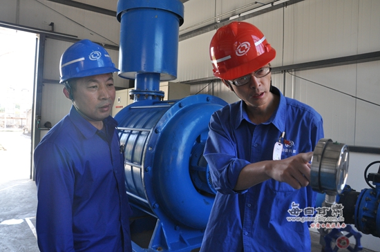 聚银公司三废处理厂岗位员工在新离心风机旁检查设备运行情况