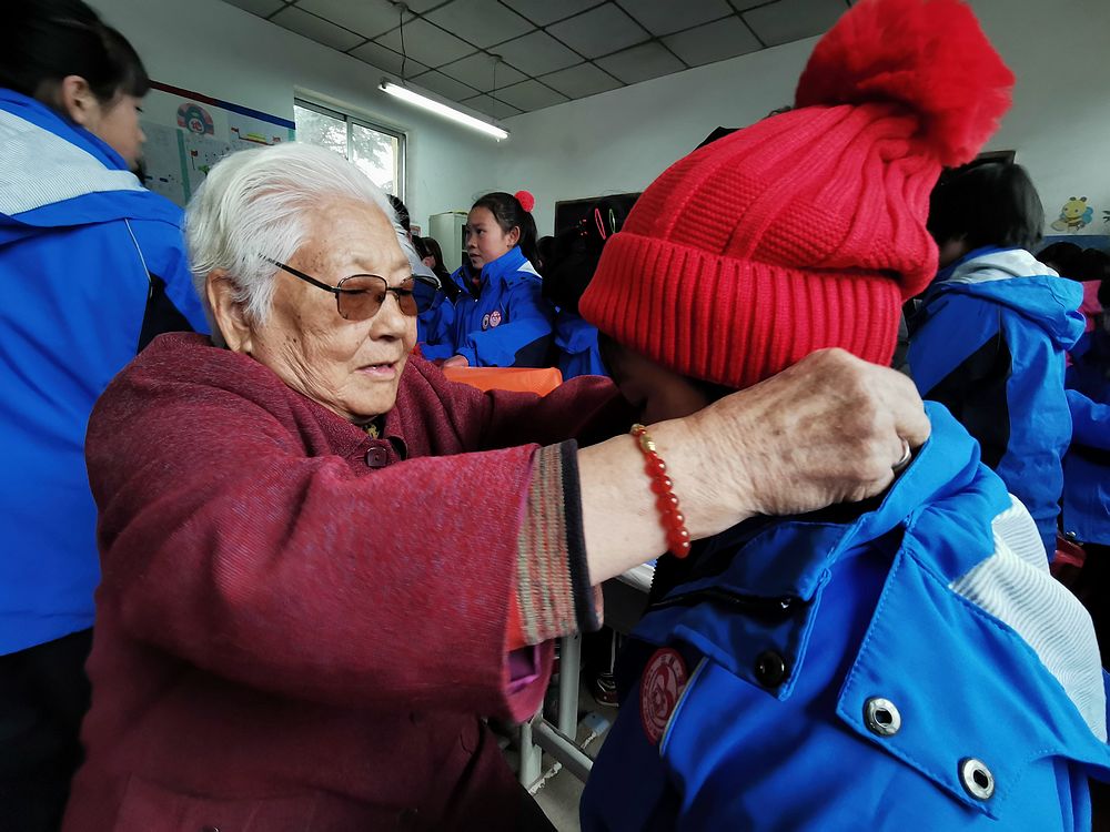 在衣物发放现场,一位满头白发的老人引起人们了注意,她为孩子扣扣子、拉领子、试衣服.....,她就是此次爱心志愿者团队中年龄最大一位,今年83岁的叶奶奶。