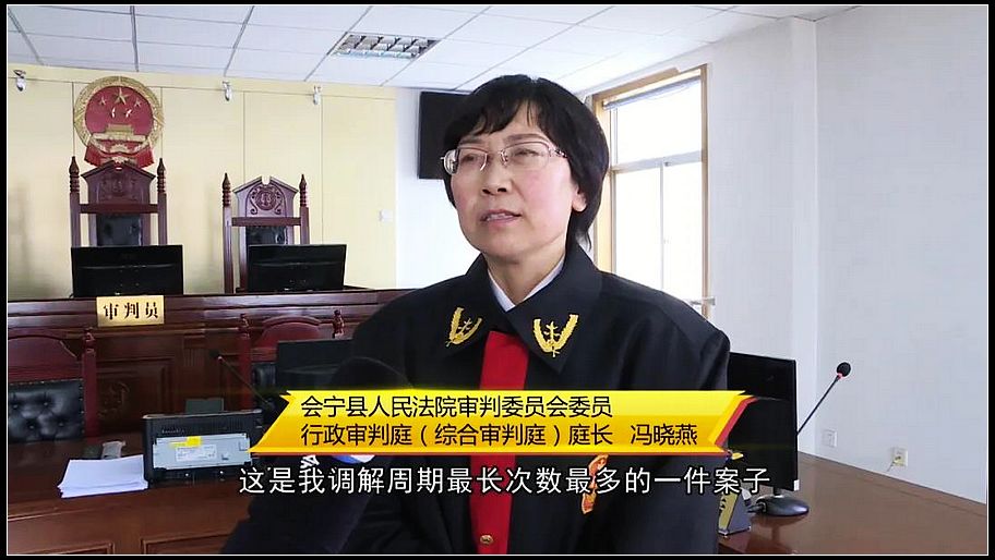 会宁县人民法院审判委员会委员、行政审判庭(综合审判庭)庭长 冯晓燕:我做法官已经26年了,这是我调节周期最长次数最多的一件案子,也是矛盾比较尖锐的案子。9月份开庭之后,我认为这个案子最好是调解处理,所以近期我一有功夫就去调解他们的案子。这个案子基本上解决了,双方当事人也比较满意。对我来说,作为一名法官得到当事人的认可,我感到非常的欣慰。