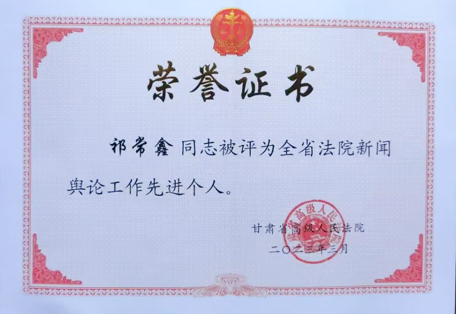 祁常鑫,景泰县人民法院综合办公室主任,2022年被甘肃省高级人民法院评为“全省法院新闻舆论工作先进个人”,被白银市委政法委评为全市政法宣传及网群工作优秀通讯员,被中共景泰县委宣传部评为“优秀通讯员”。