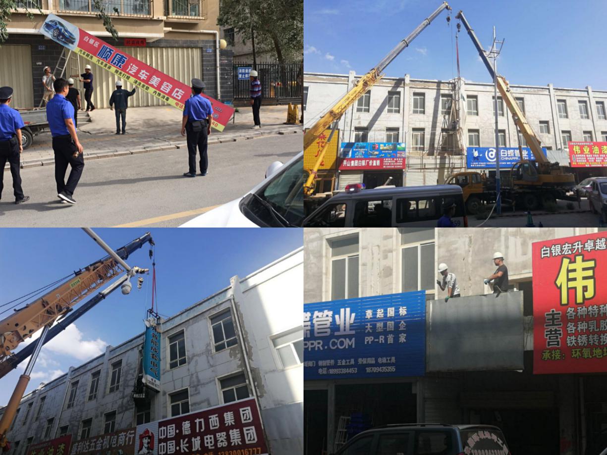 8月28日,白银市白银区城市管理综合执法局创城迎检测评集中整治工作正在紧锣密鼓地进行,除了继续整治占道经营、店外经营、乱停乱放外,还对北京路、天津路、长安路、109国道、滨河东路、万盛巷等路段存在的违规设置、残旧破损的门头牌匾、一店多招和户