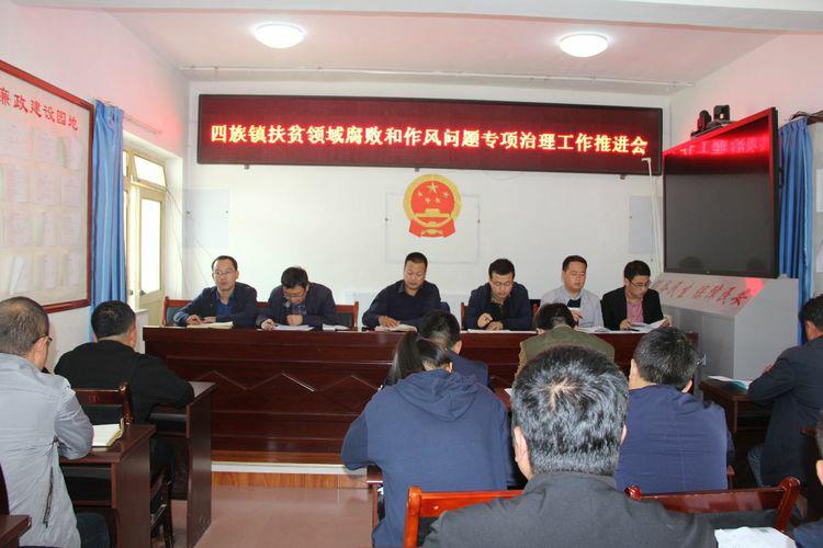 为了深入贯彻落实中央和省、市、县委关于开展扶贫领域腐败和作风问题专项治理的各项决策部署和全县深化扶贫领域腐败和作风问题专项治理推进会精神,促进脱贫攻坚各项政策全面落实,确保如期完成脱贫攻坚目标任务。9月20日,四族镇召开了扶贫领域腐败和作风问题专项治理工作推进会,镇全体机关干部、驻村帮扶工作队、各村党支部书记、村委会主任、监委会主任参加了会议。会议由镇党委副书记、政府镇长高小强同志主持。