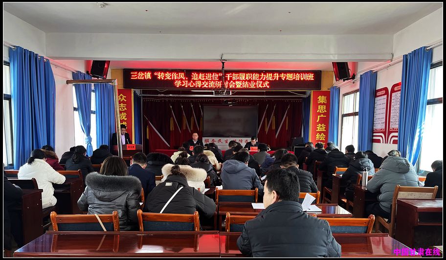 中国甘肃在线漳县讯 2月19日下午,定西市漳县三岔镇“转变作风、追赶进位”干部履职能力专题培训班在学习心得交流研讨会暨结业仪式中圆满落下帷幕,镇党委主要负责人、全体驻村干部、帮扶工作队成员、各村党支部书记共计60余人参加交流研讨。