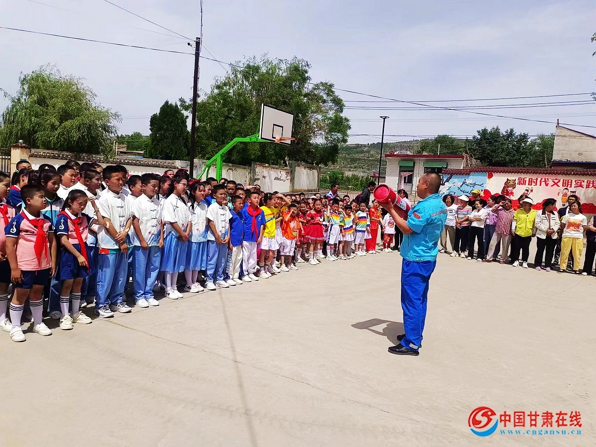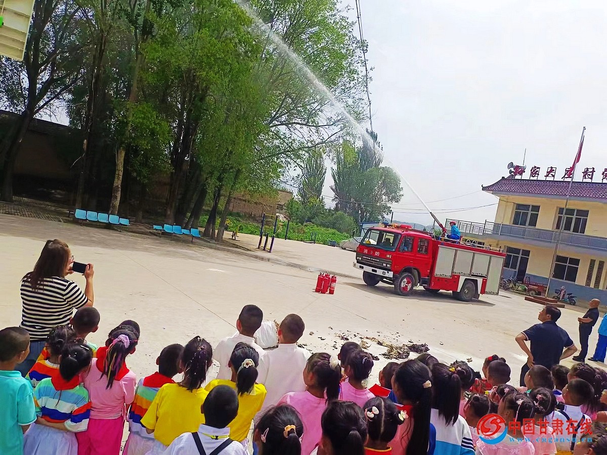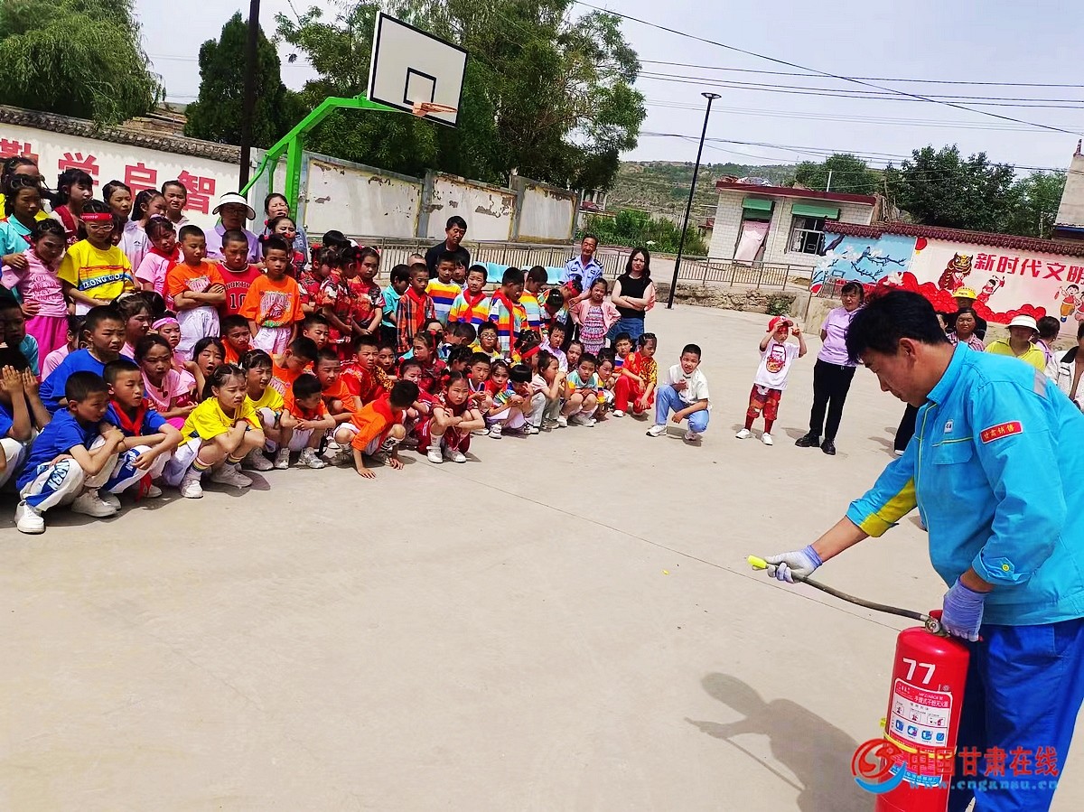 中国甘肃在线临洮讯 5月30日,中国石油甘肃销售临洮油库组织青年警消队员在第74个国际六一儿童节来临之际,走进临洮县八里铺镇孙家大庄村部小学,与孩子们一起开展了一次别开生面的消防知识“进校园”,安全防护伴“童”行宣传活动。