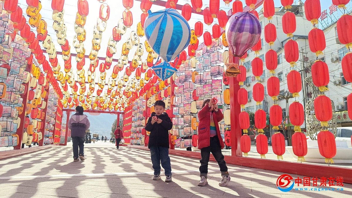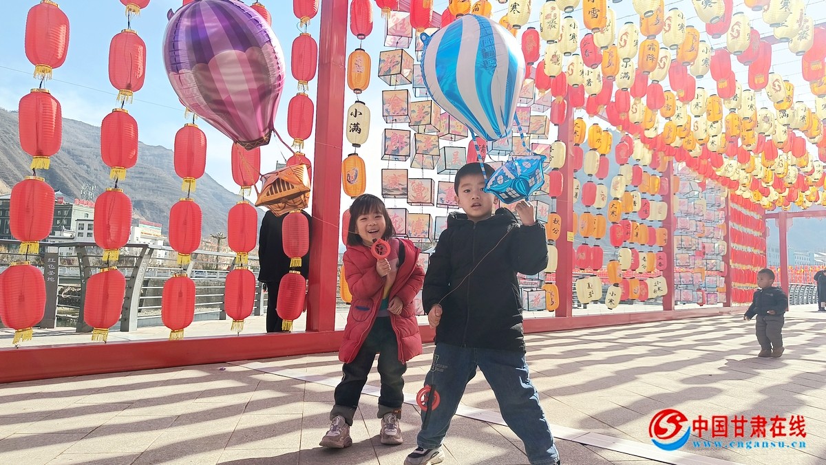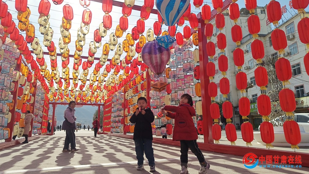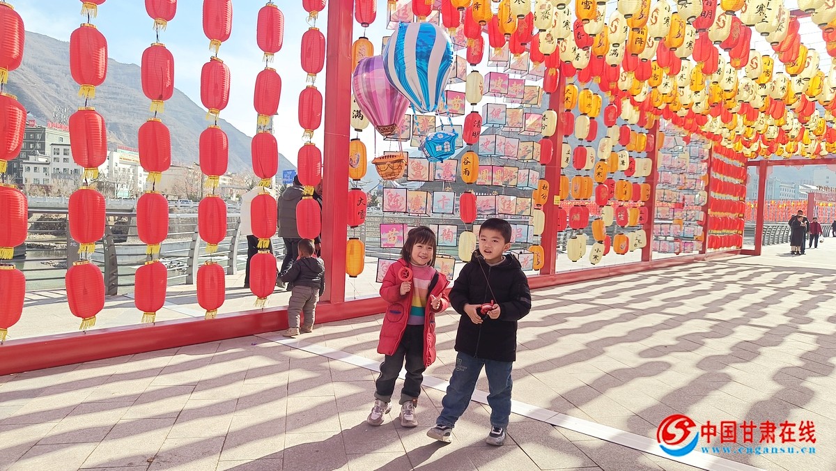中国甘肃在线宕昌讯 2月10日,两名小朋友在欢乐赏花灯”。元宵佳节,宕昌县官鹅沟口、岷江人行步道周边挂满了各式各样的彩灯,造型别致,明暗交错间霓虹闪烁,宛如一串串璀璨的宝石镶嵌在城市的脉络中。