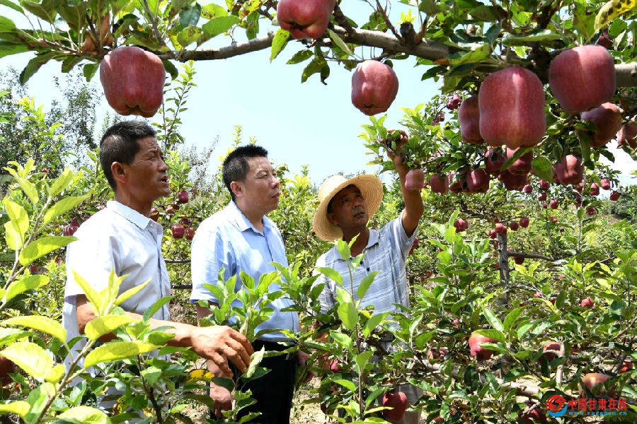 8月26日,麦积区慕达果品农民专业合作社工作人员正在果品基地查看苹果长势,红满枝头的“花牛”苹果即将迎来采摘季。
