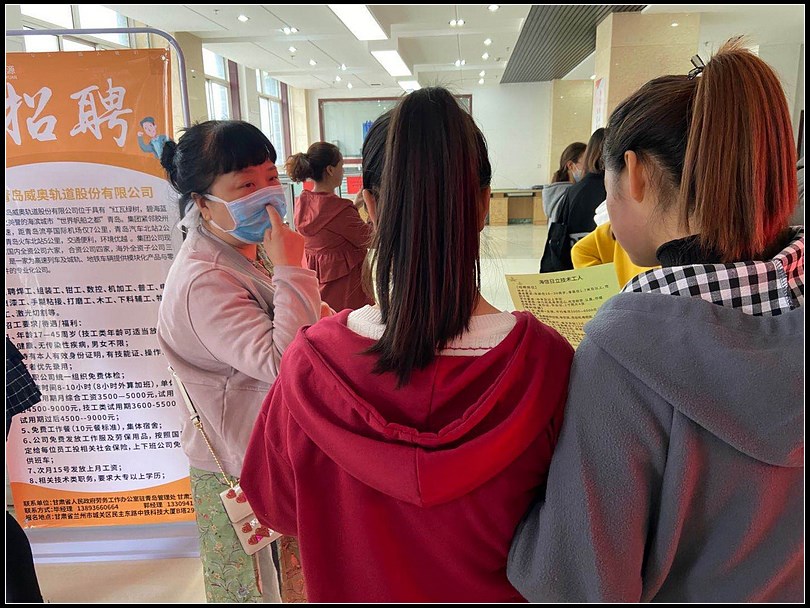 甘肃盾邦人力资源发展有限公司组织的青岛海信日立空调系统有限公司、山东春雪食品有限公司、青岛威奥轨道股份有限公司提供的用工岗位吸引了大批的求职者,这些岗位有适合年龄大、文化程度不高的求职者,有适合技能型人才的、有适合大中专毕业生的,现场有30多人留下联系方式,互动洽谈。