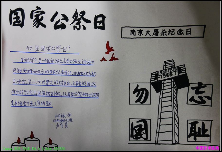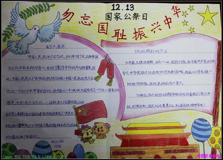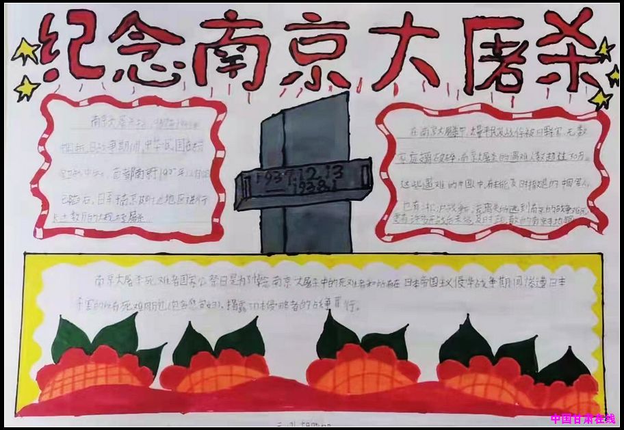 中国甘肃在线甘南讯 今天(12月13日)是第八个南京大屠杀死难者国家公祭日,山河肃穆,草木含悲。八十四年前的今天,侵华日军野蛮侵入南京,制造了惨绝人寰的大屠杀,30多万同胞惨遭杀戮, 南京大屠杀是中华民族永远最惨痛的记忆。为了让师生铭记这段难忘的历史,缅怀在南京大屠杀中遇难的30多万同胞,柳林小学于12月13日组织了以“铭记历史,勿忘国耻,振兴中华”为主题的系列活动。