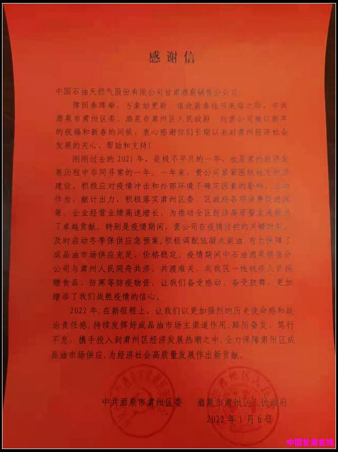 • [酒泉]酒泉市各级政府向中国石油甘肃酒泉销售分公司发来感谢信
