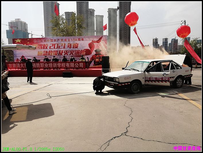 中国甘肃在线兰州讯 (赵小春报道)4月16日下午,兰州市应急管理局在鑫隆驾校举办交通运输应急救援和灭火演练。记者在应急救援和灭火演练现场看到,一辆驾校训练车辆在教练行驶途中,因为线路故障突然发生火灾事故,从驾驶员位置冒出一股黒浓烟,车内有