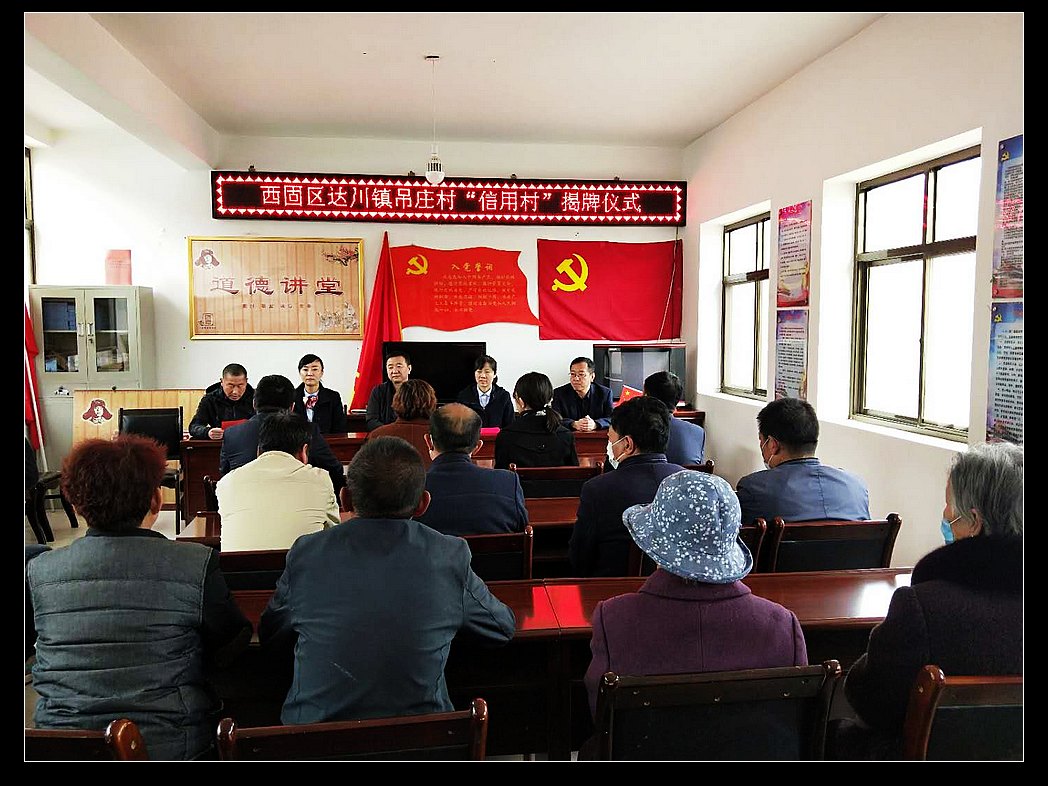 3月26日,兰州市西固区达川镇吊庄村举行“兰州农商银行信用村”揭牌仪式。西固区金融办主任、达川镇党委书记、兰州农商银行负责人、吊庄村主要负责人和部分村民参加了此次活动。仪式上,西固区金融办主任和兰州农商银行三农业务部经理共同为吊庄村“信用村