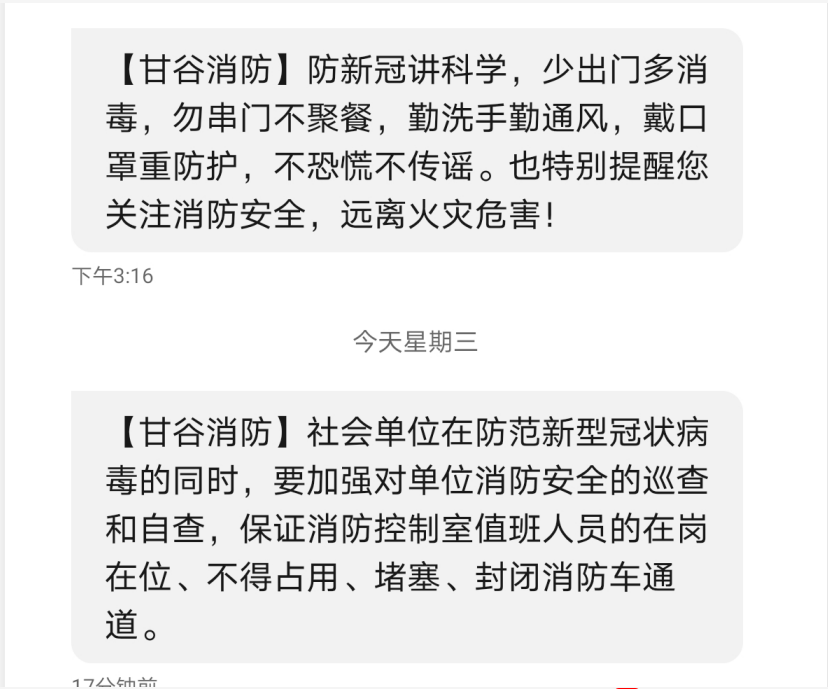 • [天水]甘谷消防发送消防安全短信助力疫情期间消防安全宣传