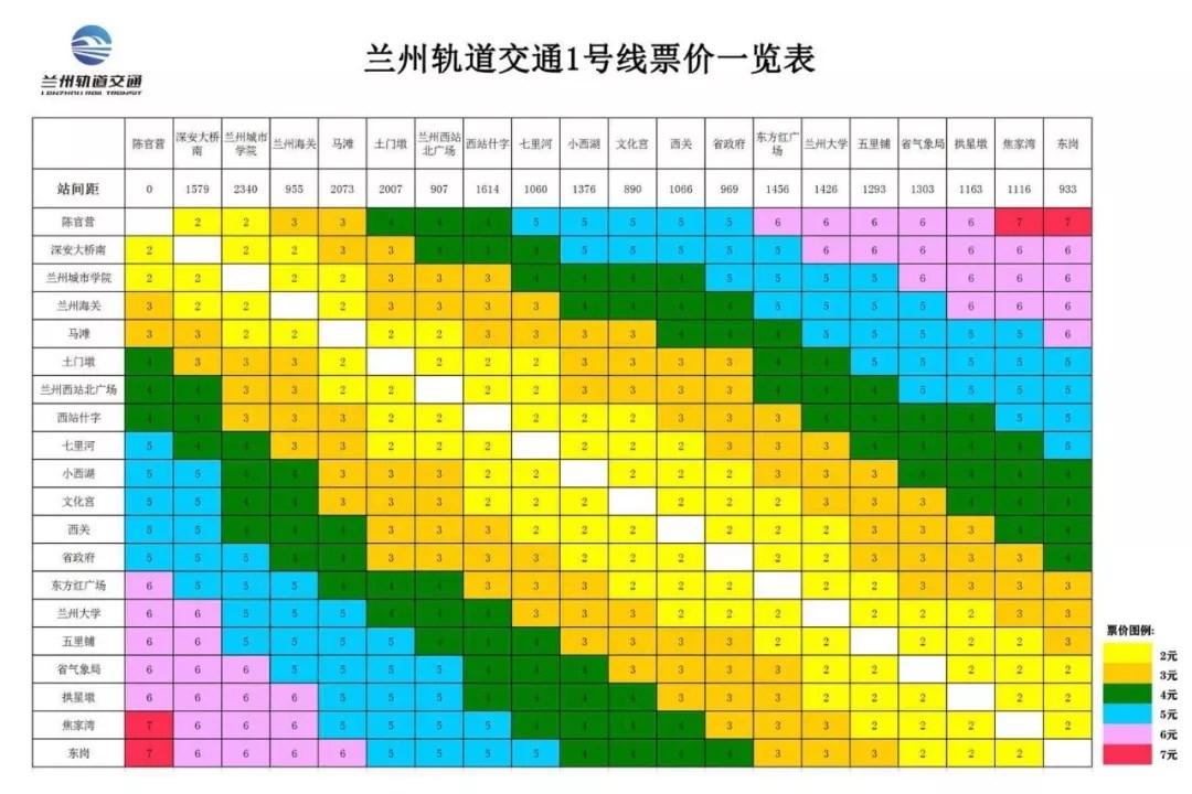 • [兰州]兰州地铁1号线票价图及优惠政策公布!起步价2元,全线7元