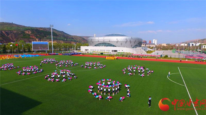 演出现场  中国甘肃在线讯 (记者 宋芳科 杨成 文/图) 4月20日下午,在崇信县第三届“山水龙泉·养生崇信”文化旅游节暨第一届全民运动会开幕式上,伴随着县歌《尊崇信任聚力量》铿锵明快的节奏,来自崇信二中的750