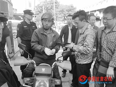 对摩托车交通违法行为进行查处。兰州晨报首席记者 裴强 摄  9月21日上午,在兰州主城区道路交通管理专项督查行动指挥部的统一安排部署下,兰州市公安局交警支队各交警大队在辖区范围内展开了摩托车交通违法行为