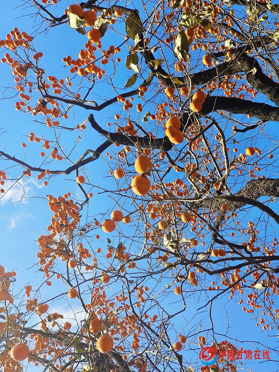 中国甘肃在线两当讯 甘肃省两当县杨店镇的秋,满山的柿子树,金黄的柿子叶,红彤彤的柿子宛如一幅浓墨重彩的山水画。秋风唤醒了沉睡的柿子,一颗颗沐浴着金色的阳光,柿子采摘的身影和林间的笑语呈现了一幕波澜壮阔的情景剧。