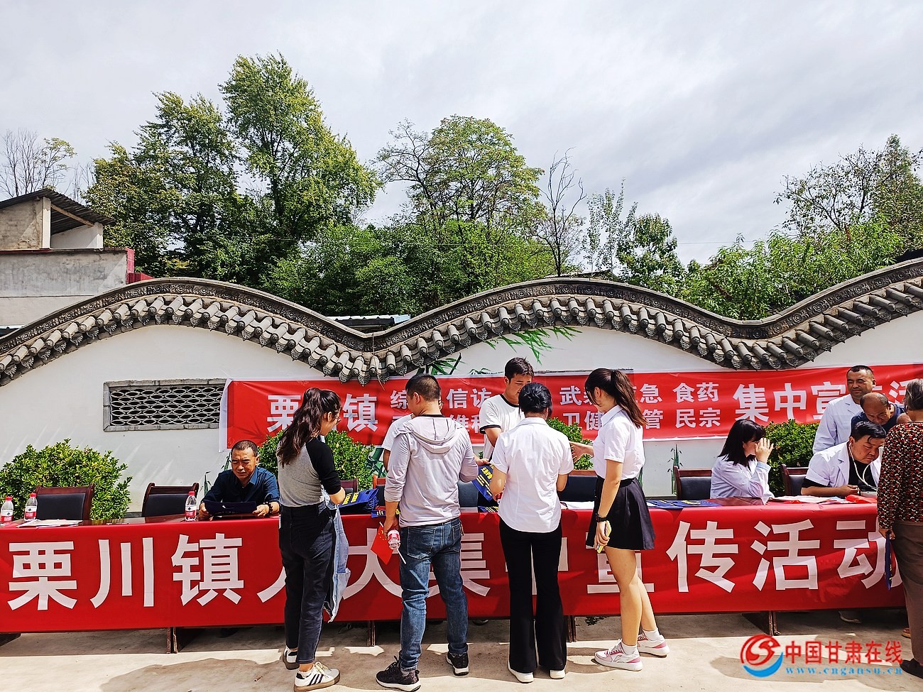 中国甘肃在线徽县讯 9月19日,徽县栗川镇以中国农民丰收节为契机,在范寺村广场组织镇人大办、民宗办、市场监督管理所、综治中心(镇禁毒办)、司法所、交管站以及辖区派出所、卫生院等多部门联合开展集中宣传活动,以发放宣传资料、现场讲解政策、典型案